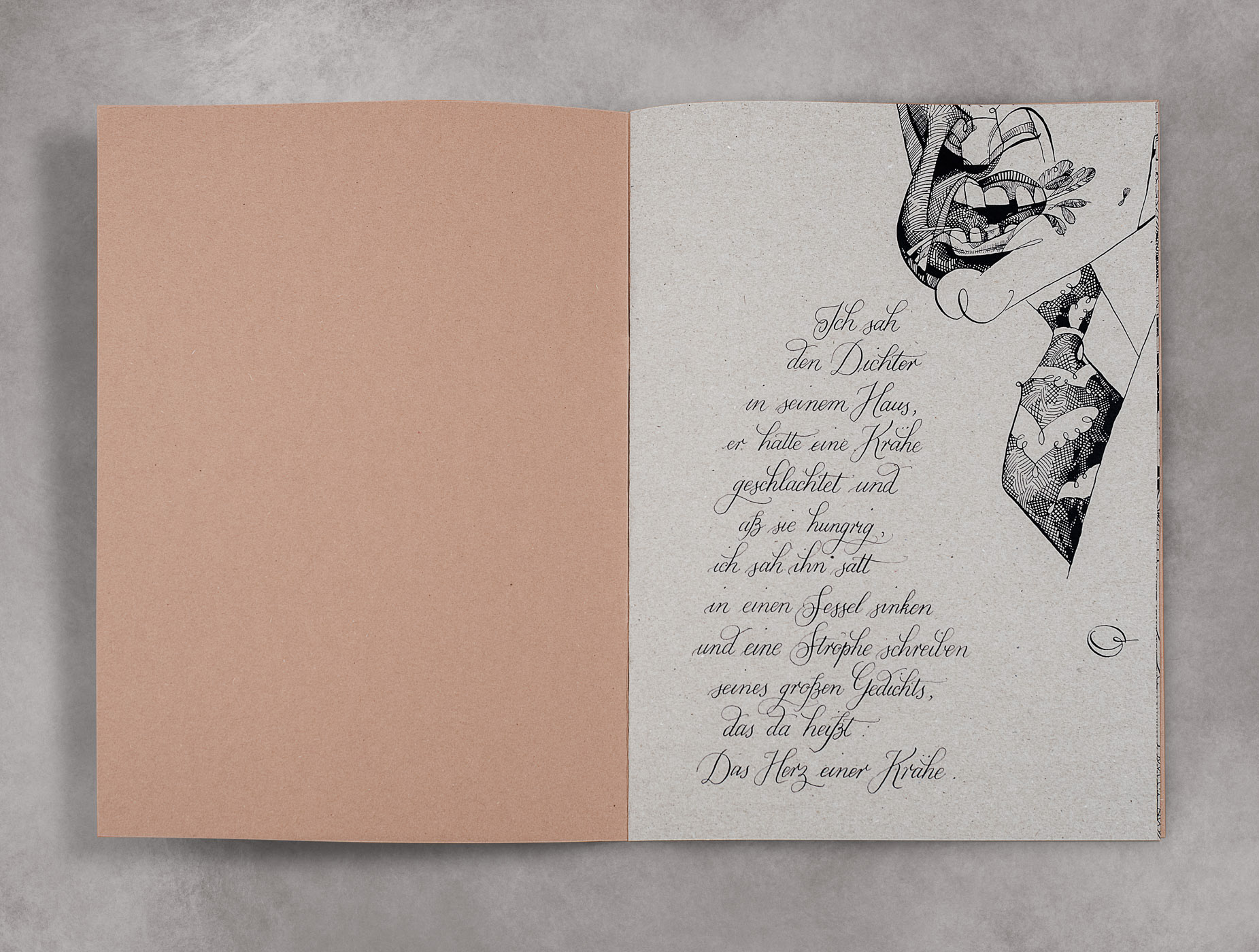 One of my favorite projects from 2015 – an illustrated story after a short poem by Christoph Meckel. It is about a passionate poet who writes his great "Heart of a Crow". Trying to dig deeper into the topic he eats a real bird... Here begins the story about his gradual metamorphosis.